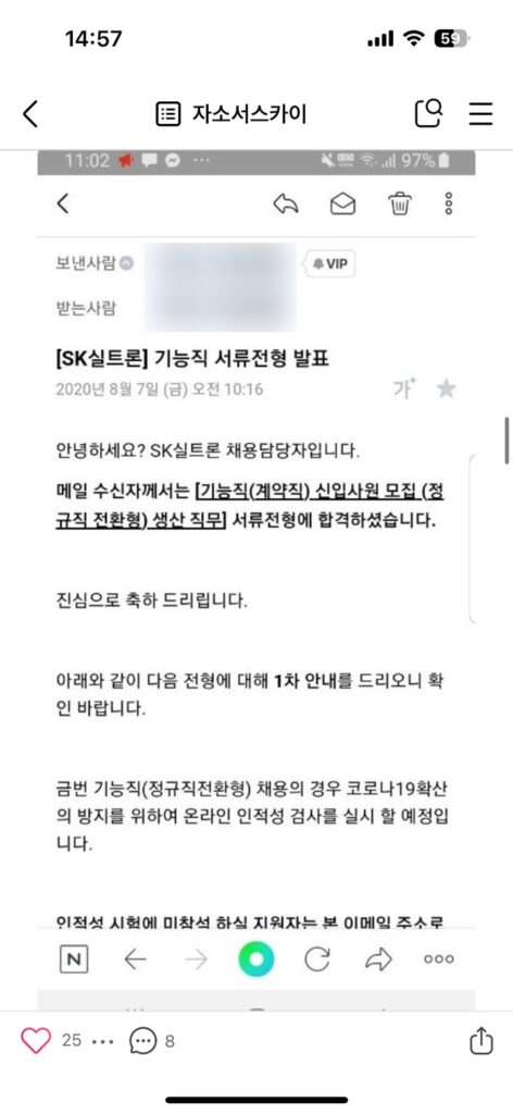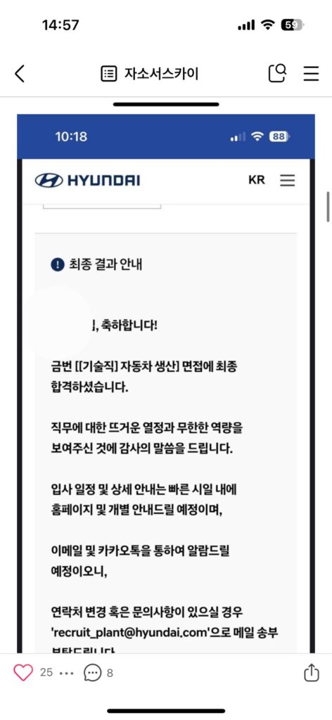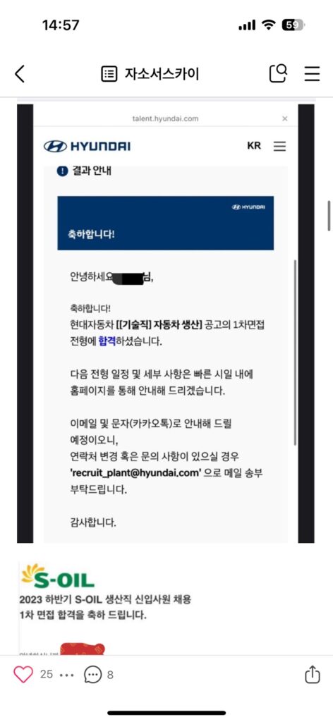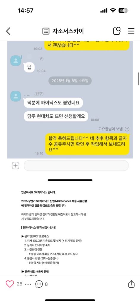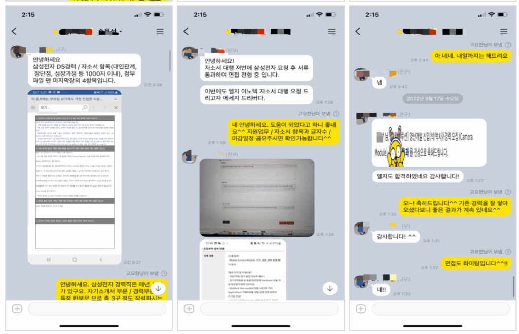 오늘 마감인 공고를 오후에 부탁드렸는데도 너무 자세하고 정성 들여 작성해주셔서 정말 감사했습니다. 제가 가지고 있는 경험을 어떻게 풀어써야 할지 막막했는데 너무 읽기 쉽고 예쁘게 작성해주셨어요!! 어필하고 싶었던 역량과 경험을 직무에 딱 맞춰서 직무 관심도까지 합해서 완성시켜주셨습니다..!! 답변도 정말 빠르시고 정말 친절하게 안내해주셔서 너무 좋았어요.. 사실 그동안 컨설팅같은걸 받으면 괜히 자존감만 낮아질까봐 혼자서만 고군분투했었는데 진작 받을걸 그랬었나 후회가 되기도합니다 ㅎㅎ 아무튼 정말 감사했습니다!!